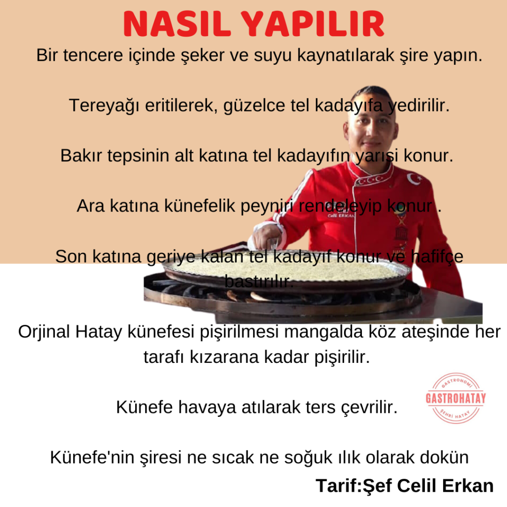 orjinal Hatay künefesi pişirilmesi mangalda köz ateşinde her tarafı kızarana kadar pişirilir. Künefe havaya atılarak ters çevrilir.